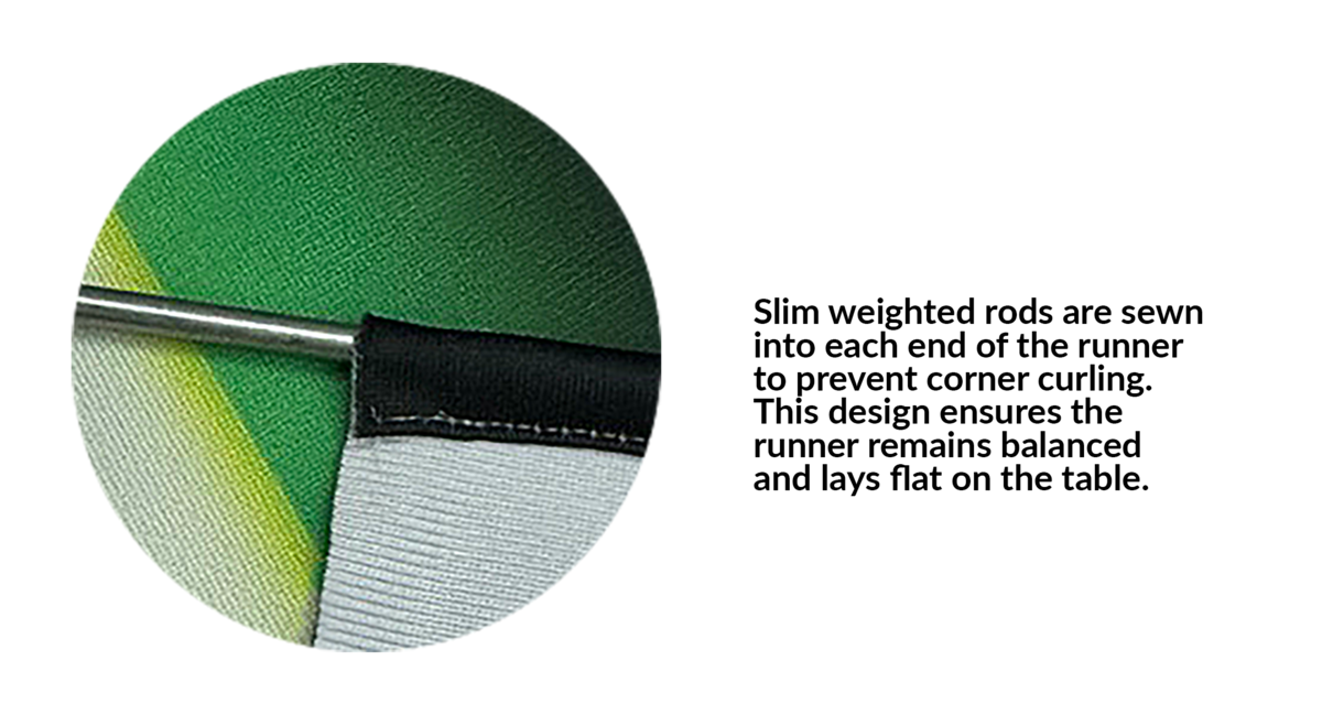 Slim weighted rods are sewn into each end of the runner to prevent corner curling. This design ensures the runner remains balanced and lays flat on the table.